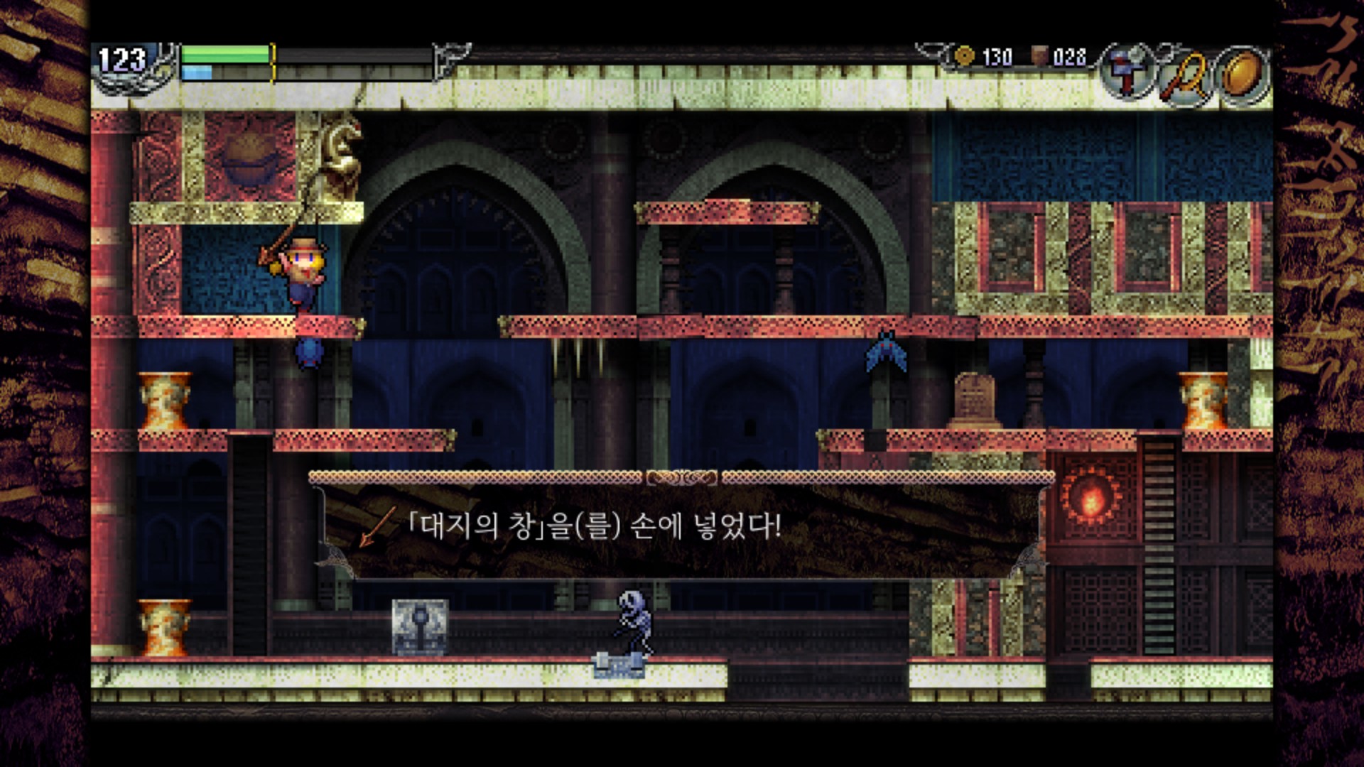 하단의 돌을 옮기면 좌측 사다리가 개방되고, 해당 사다리를 타고 올라가 상단 플랫폼의 밟는 스위치를 누르면 무기 대지의 창 입수.