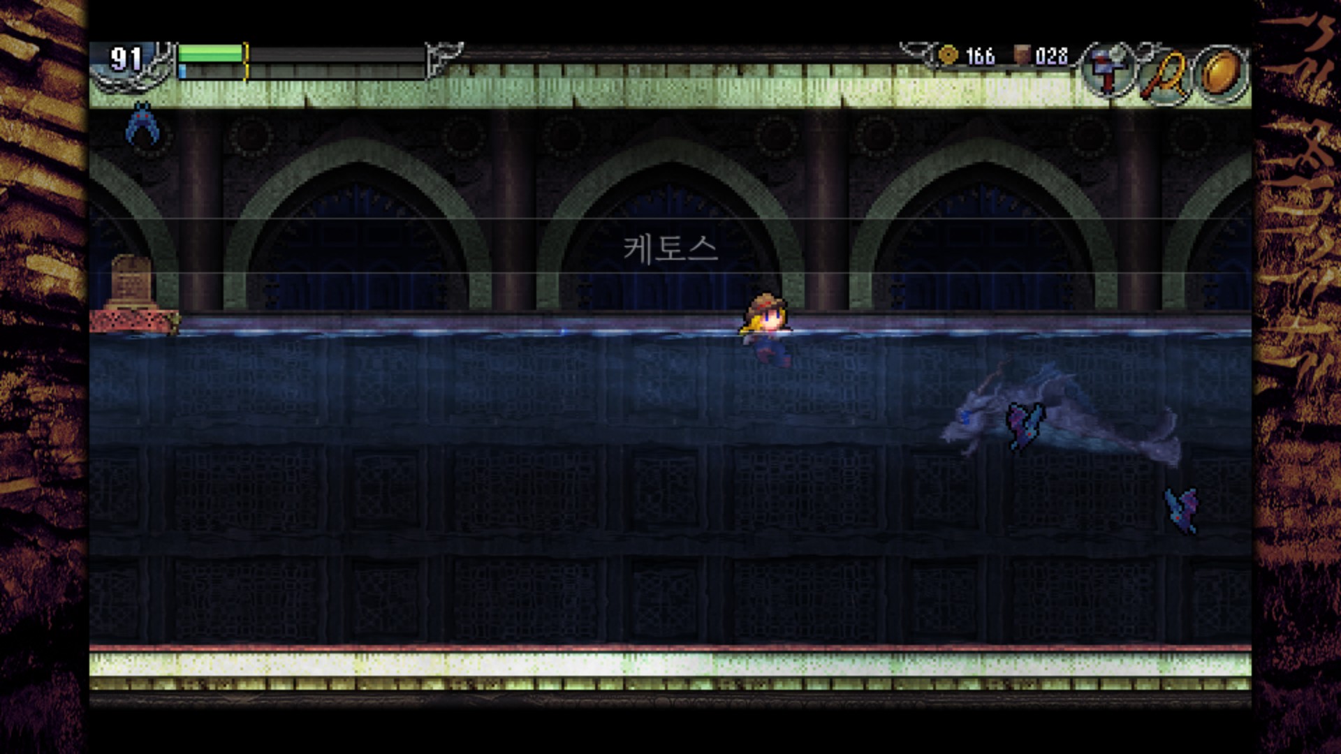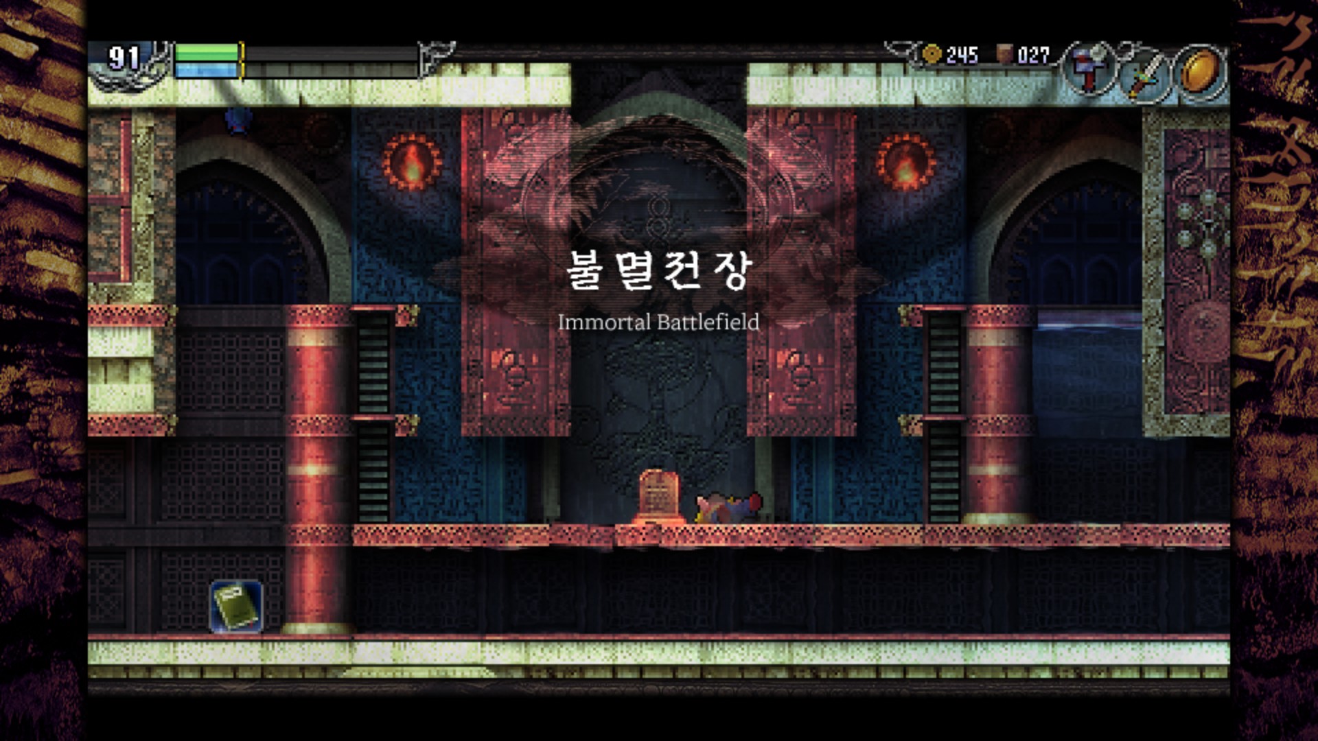 > 해당 방에서 다시 사다리를 타고 위쪽으로. 보스전을 했던 방 아래쪽 방으로 가보면 밟는 스위치가 있다. 이 스위치를 밟으면 불멸전장에 수로가 개방된다. 참고로 이 개방된 수로 쪽으로 돌아서 가면 도감 케토스 획득 가능