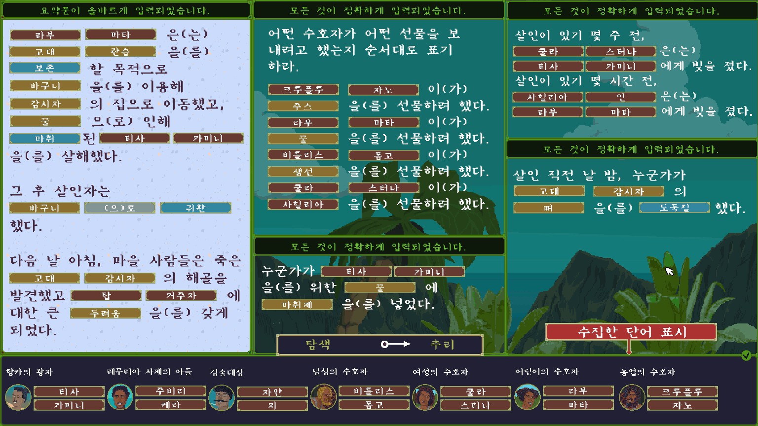 게임버전 2023년 12월 05일(v1.3.3) 기준 (스팀 링크) 더 케이스 오브 더 골든 아이돌(황금 우상 사건)은 자유롭게 추리하고 탐색할 수 있는 신개념 탐정 게임입니다. 열두 가지의 기묘하고 잔혹한 살