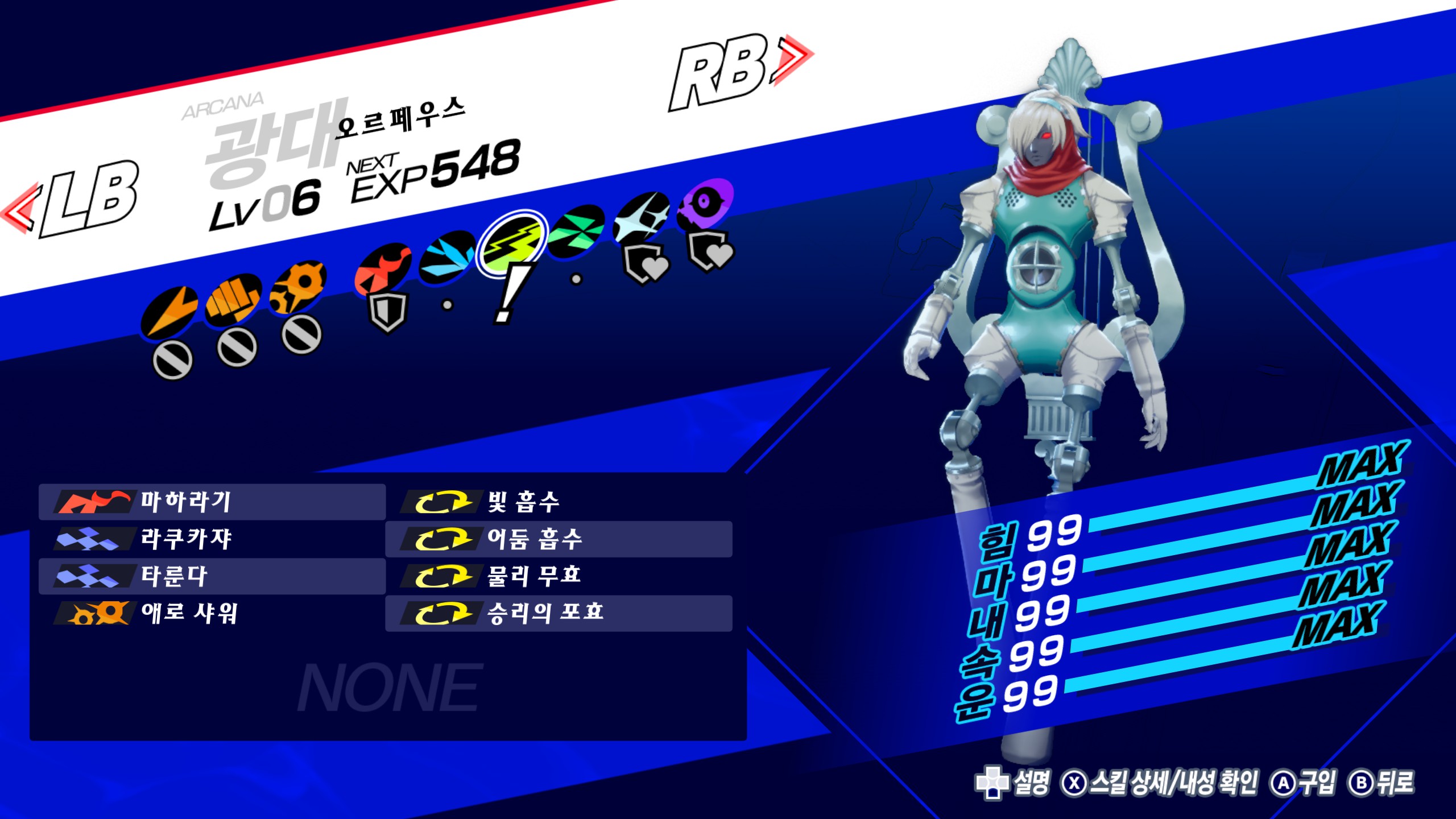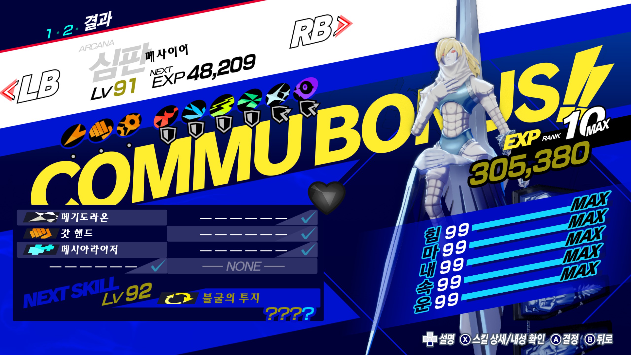올 스탯 99의 페르소나는 전서 100% 기준 스킬, 레벨 무관 120,008의 소환 가격을 가진다. 따라서 레벨에는 크게 신경 안써도 되고