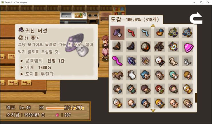 - 어느 정도 무기가 갖춰졌으면 로그라이크 던전에 도전해보자. 20층, 40층 (확실치 않음)에서 '무기 높이 올리기'와 '무기 탄' 오의를 주는데, 전자는 던지기와 같이 무기를 파기해서 반경 5X5 데미지, 후자는 무기 내구도 1 소모해서 직선 원거리 공격.